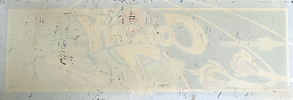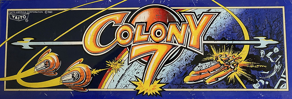 An original marquee for the upright cabinet version of the video arcade game Colony 7.  Printed on acrylic, 23 x 8 in.  1981 Taito