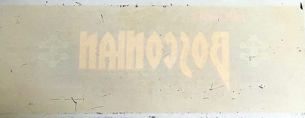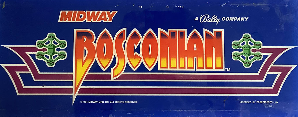An original marquee for the upright cabinet version of the video arcade game Bosconian. Printed on acrylic, 23.5 x 9 in. 1981 Bally Midway