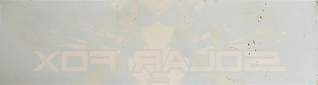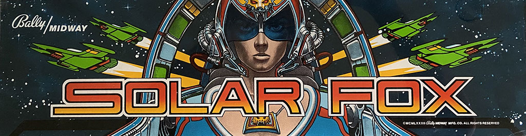 An original marquee for the upright cabinet version of the video arcade game Solar Fox.  Printed on acrylic, 23 x 6.5 in.  1982 Bally Midway