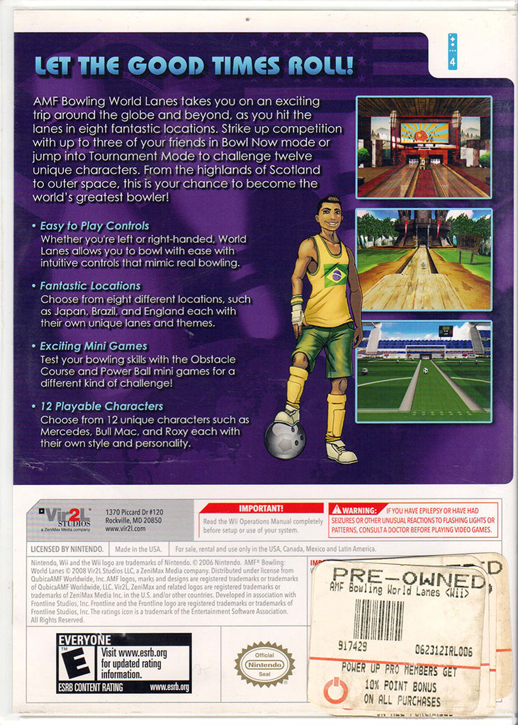 AMF Bowling World Lanesin Arcade > Console > Nintendo Wii > Software A four-player bowling game for the Nintendo Wii, developed by Frontline Studios and published in 2008 by Vir2L Studios. Front Cover Back Cover https://dev3.petecahill.com/wp-content/uploads/2024/04/24040702-1-1.jpg 1024 735 Pete https://dev3.petecahill.com/wp-content/uploads/petecahill/petecahillcomlogoheader.gif Pete2024-04-07 00:02:112024-04-13 17:28:32AMF Bowling World Lanes