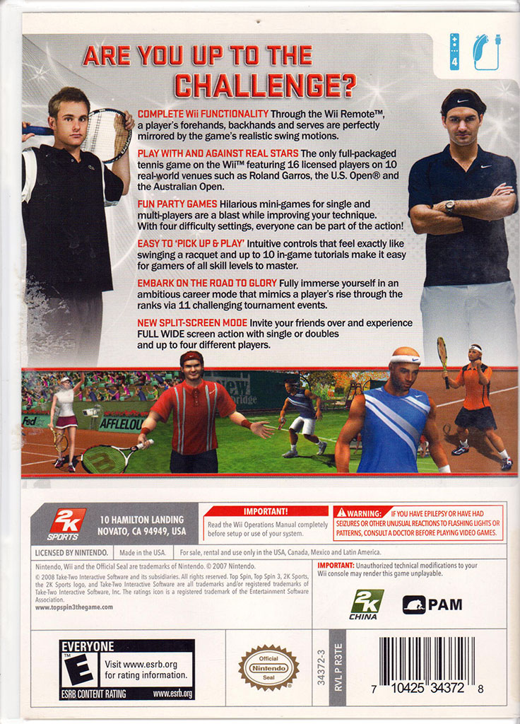 Top Spin 3in Arcade > Console > Nintendo Wii > Software A four-player tennis game for the Nintendo Wii, developed by PAM Development and published in 2008 by 2K Sports. Front Cover Back Cover https://dev3.petecahill.com/wp-content/uploads/2024/04/24040708-1-1.jpg 1024 732 Pete https://dev3.petecahill.com/wp-content/uploads/petecahill/petecahillcomlogoheader.gif Pete2024-04-07 00:08:312024-04-13 15:06:36Top Spin 3