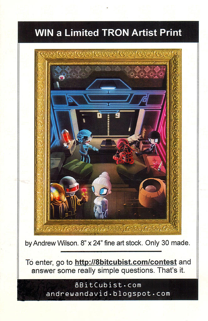 A postcard-sized advertisement for the 8BitCubist.com website featuring Tron-themed art by Andrew Wilson, printed on glossy card stock. 2010 8BitCubist.com